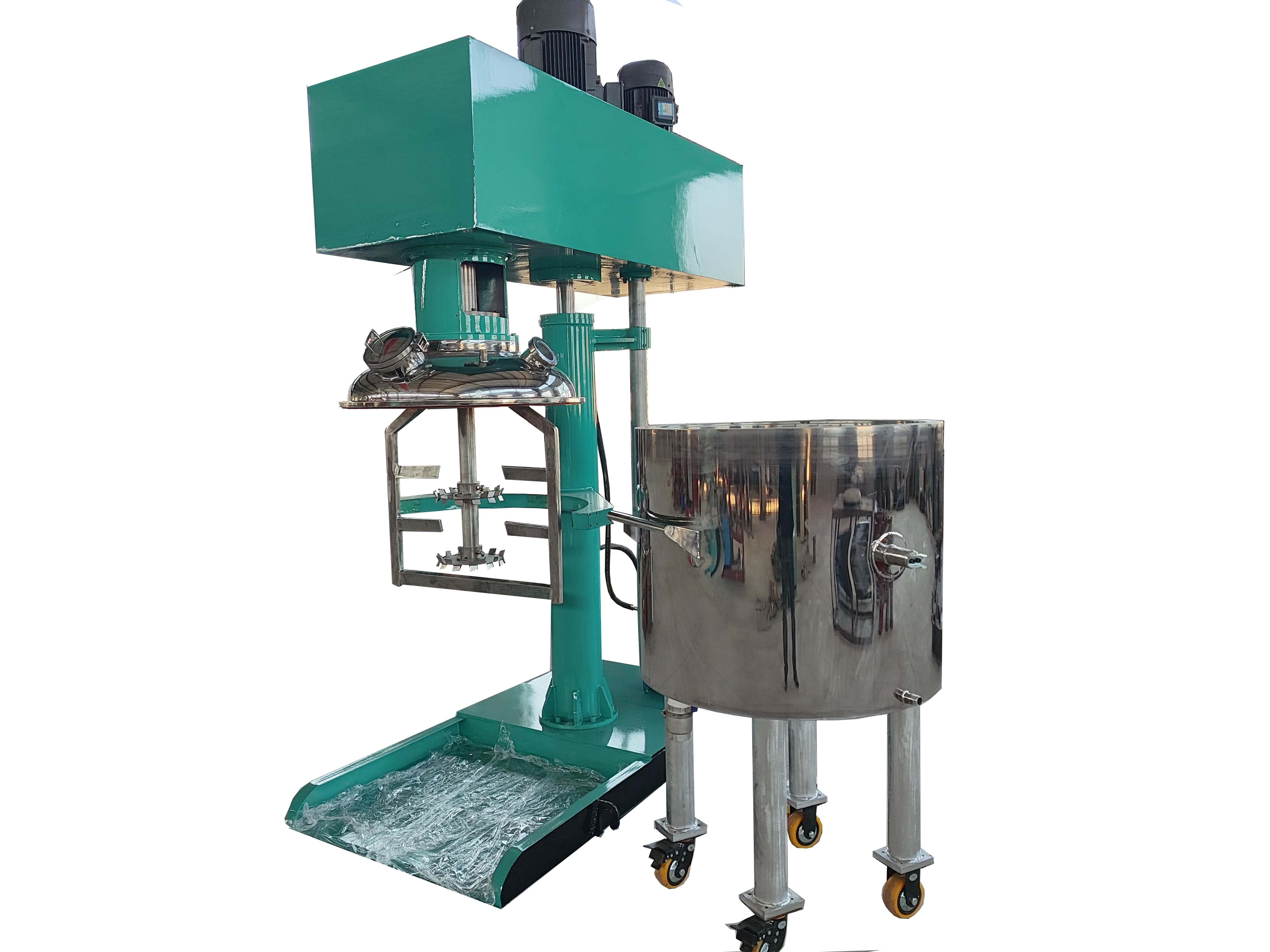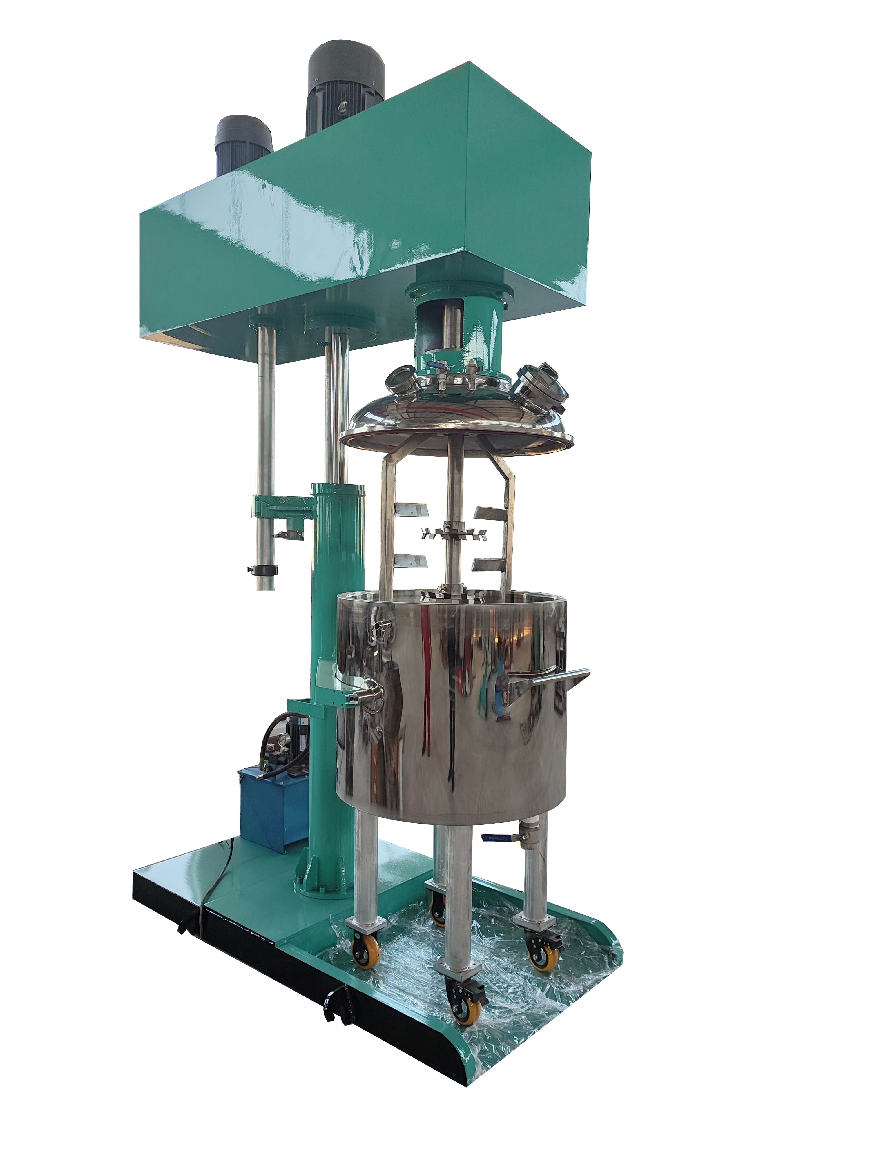 高、低速雙動力設(shè)計;匹配的動能驅(qū)動高速分散器高速旋轉(zhuǎn)使攪拌缸內(nèi)的液體物料呈現(xiàn)滾動的環(huán)流,并產(chǎn)生-定范圍的旋渦,物料同時受到較強的剪切和沖擊,配合帶有活動刮壁的低速攪拌器,把粘附在容器壁上的物料推向高速分散器的做功范圍,使兩種或兩種以上的物料很快得到分散、混合,使產(chǎn)品無色差、均勻度好、 透明度高??蚴綌嚢杵髦饕鉀Q拌合及物料粘壁問題,物料分散主要由中心分散器完成,從而各取所長,避其所短,使攪拌更快速,效率更高,混合更充分。根據(jù)工藝情況,高速實心軸與低速空心主軸間以及低速空心主軸與機架間均可安裝機械密封,從而實現(xiàn)真空作業(yè)。