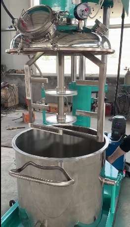 釜內(nèi)特別增加一個(gè)或兩個(gè)高速分散器,在公轉(zhuǎn)的同時(shí)高速自轉(zhuǎn),使各種物料受到強(qiáng)烈的剪切與分散混合,效果是普通混合機(jī)的幾倍。同時(shí)也可更改為高剪切乳化劑或研磨機(jī)等特種設(shè)備。