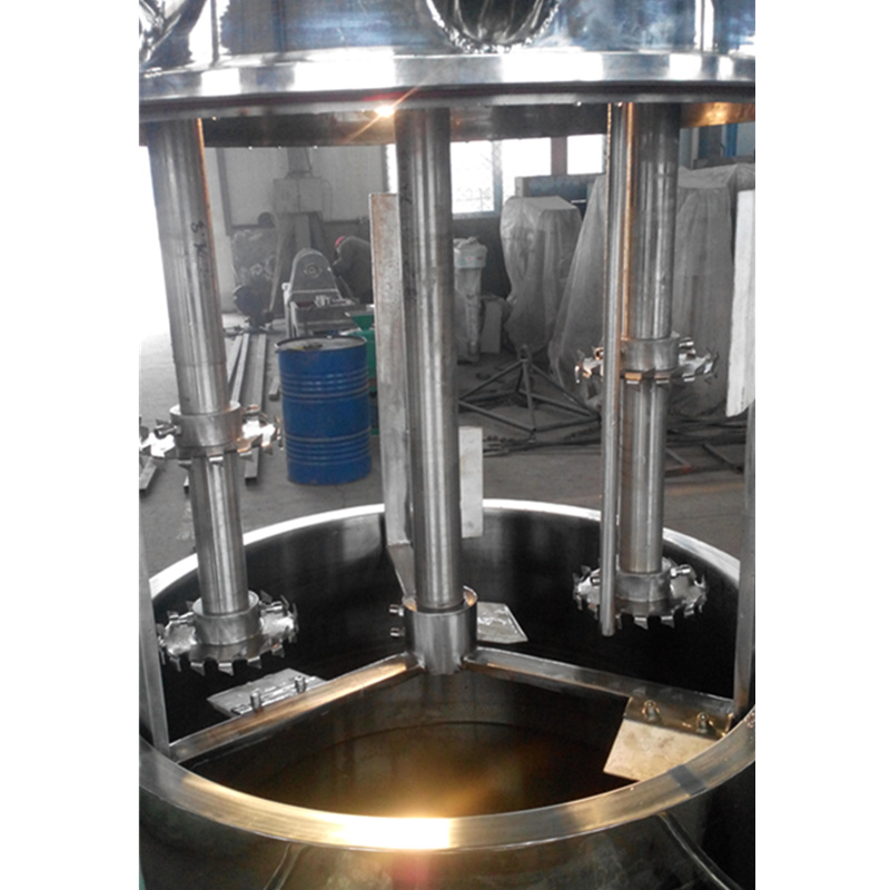 強(qiáng)力分散機(jī)罐內(nèi)有三根不同形式的攪拌器,其中一個(gè)攪拌器在繞釜體軸線轉(zhuǎn)動(dòng),其余兩個(gè)攪拌裝置又以不同的轉(zhuǎn)速,繞自身輪線高速自轉(zhuǎn),使物料在釜內(nèi)作復(fù)雜的運(yùn)動(dòng),受到強(qiáng)烈的剪切和搓合.設(shè)備內(nèi)山字?jǐn)嚢铇@釜體軸線轉(zhuǎn)動(dòng),將粘在壁上和底部的原料刮出,使其效果更為理想。設(shè)備密封性好,可抽真空,具有良好的排氣除泡效果。